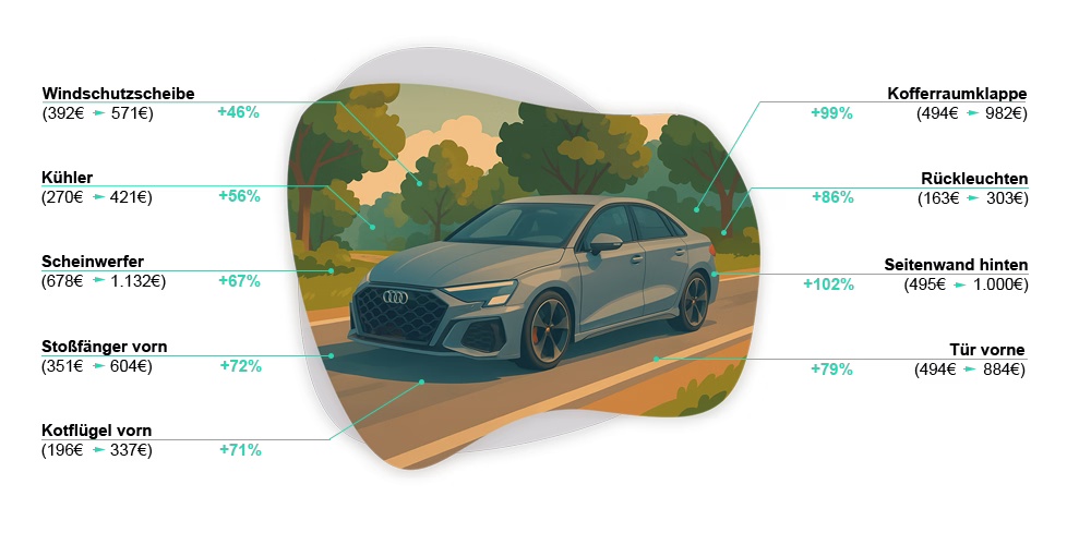 Quelle: http://www.gdv.de, durchschnittliche Preise (inkl. 19% MwSt.) für ausgewählte Ersatzteile repräsentativer Fahrzeugtypen von 2014 – 2024.